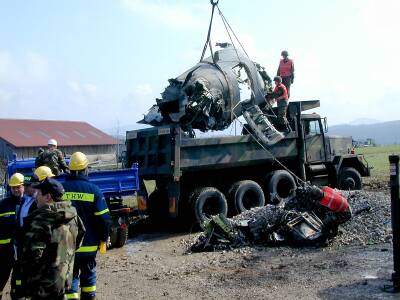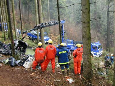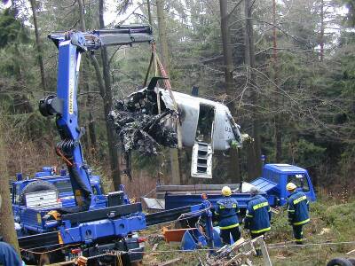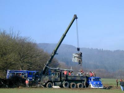 Am Donnerstag den 29.03.01 hat der OV Lauf, in Zusammenarbeit mit dem US-Militär und Helfern aus den Ortsverbänden Amberg und Baiersdorf, begonnen das Flugzeugwrack aus dem unzugänglichen Gelände (Berghang) zu bergen.