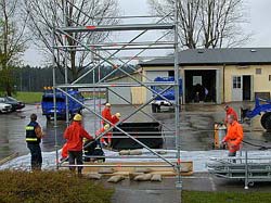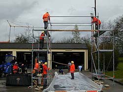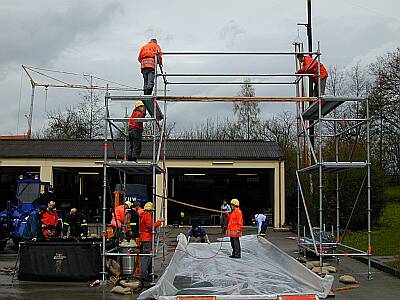 Mit den im Moment zu Verfügung stehenden Mitteln (aus Eigenbeständen des Ortsverbandes), wurde ein Portal aus Teilen des übungsturmes und des Stegebausatzes angefertigt.