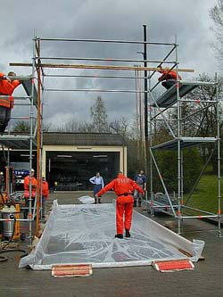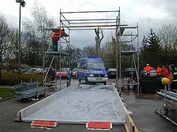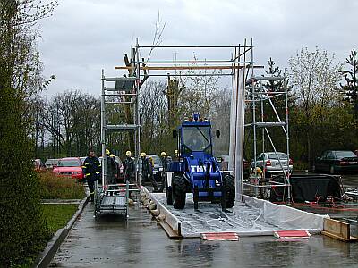 Mit Dielen, Kanthölzern und Folien schuf man eine Wanne, mit der das Desinfektionsmittel wieder aufgefangen werden kann. über vier Schlauchbrückenteile wird dieses Becken befahrbar gemacht.