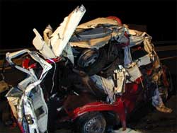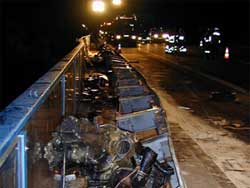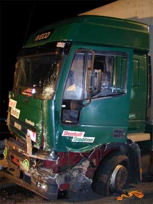 nach rechts auf die Schutzplanke und begrub den VW-Bus unter sich. Der Lkw prallte mit seiner linken Seite