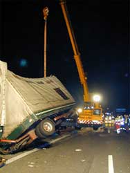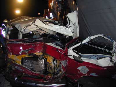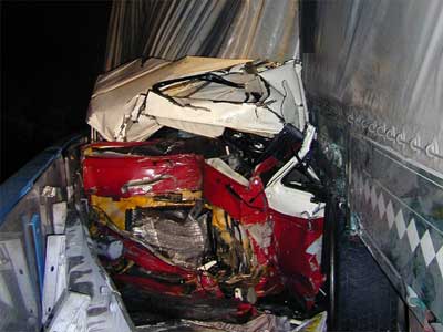 nach rechts. Der Kleinbus wurde zwischen Leitplanke und Lkw eingeklemmt, der Anhänger des Lkws kippte
