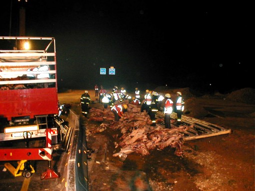 Nach dem Eintreffen der Hilfskräfte stellte sich heraus, dass die Ladung des 40-Tonner - 20 Tonnen Rinderhälften -