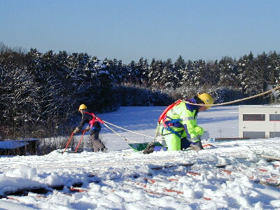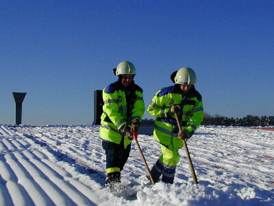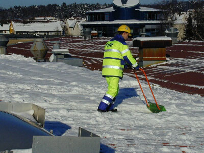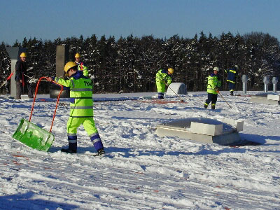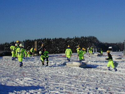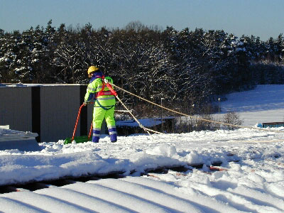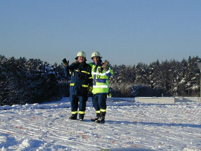 Bei Eintreffen an der Einsatzstelle zeigte sich folgende Lage: Das Dach einer Produktionshalle mit den Abmessungen 30 x 65 Metern war mit ca. 30cm Schnee bedeckt. Problem war, dass es sich hierbei um eine 15 Meter Hohe Halle handelte. Ferner bestand auf dem Dach starke Rutschgefahr. Aus diesem Grund wurden die Helfer über einen Festpunkt und den Auffanggurten gesichert, ehe man mit dem Schneeschaufeln beginnen konnte.