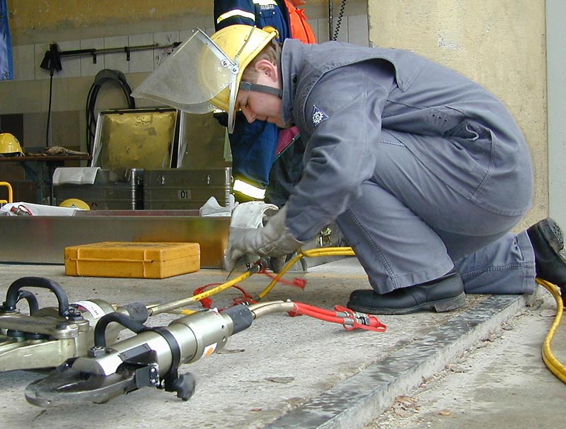 | Bei der praktischen Prüfung wurde neben dem Einsatz des hydraulischen Rettungsspreizers und der Rettungsschere sowie diverser