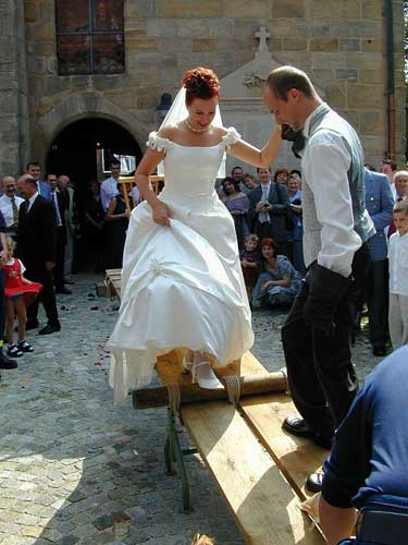 Natürlich kam auch er nicht umher, eine kleine Aufgabe vor aller Augen zu überstehen. Auf einer Wippe musste er seine frisch angetraute Ehefrau mit Sandsäcken aufwiegen, was ihm nach kurzer Zeit auch sehr gut gelang.